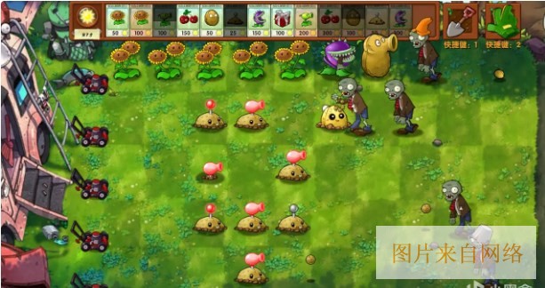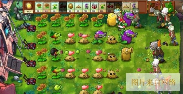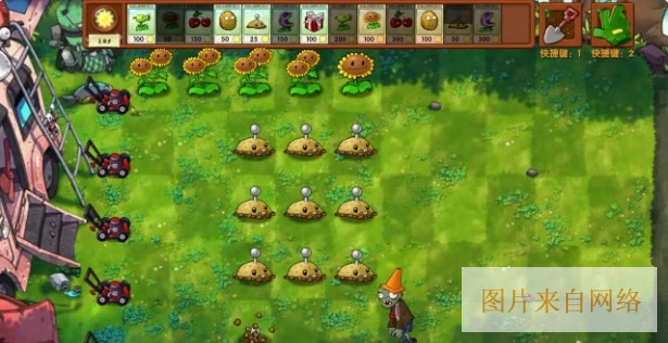2、使用高于向日葵高度的坚果保护一路,其他路可以都种上“豌豆土豆雷”和“豌豆坚果墙”。