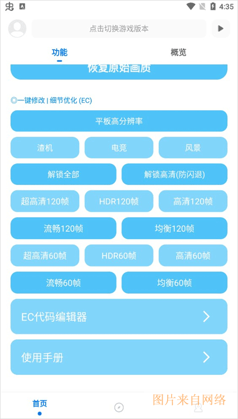 殇痕画质助手app是一款无需做任务就能免费使用的游戏画质修改工具,软件的功能强大实用,只需要简单的设置操作就能够增强游戏中的画质效果,还有非常齐全的专业画质工具帮助你进行自定义修改设置,能够从画质帧数、清晰度多方面改善,无论是60帧、120帧都是能够支持的,不同的帧数还能选择不同的清晰度,非常人性化,在提高了游戏画面流畅度的同时还能升级音效。