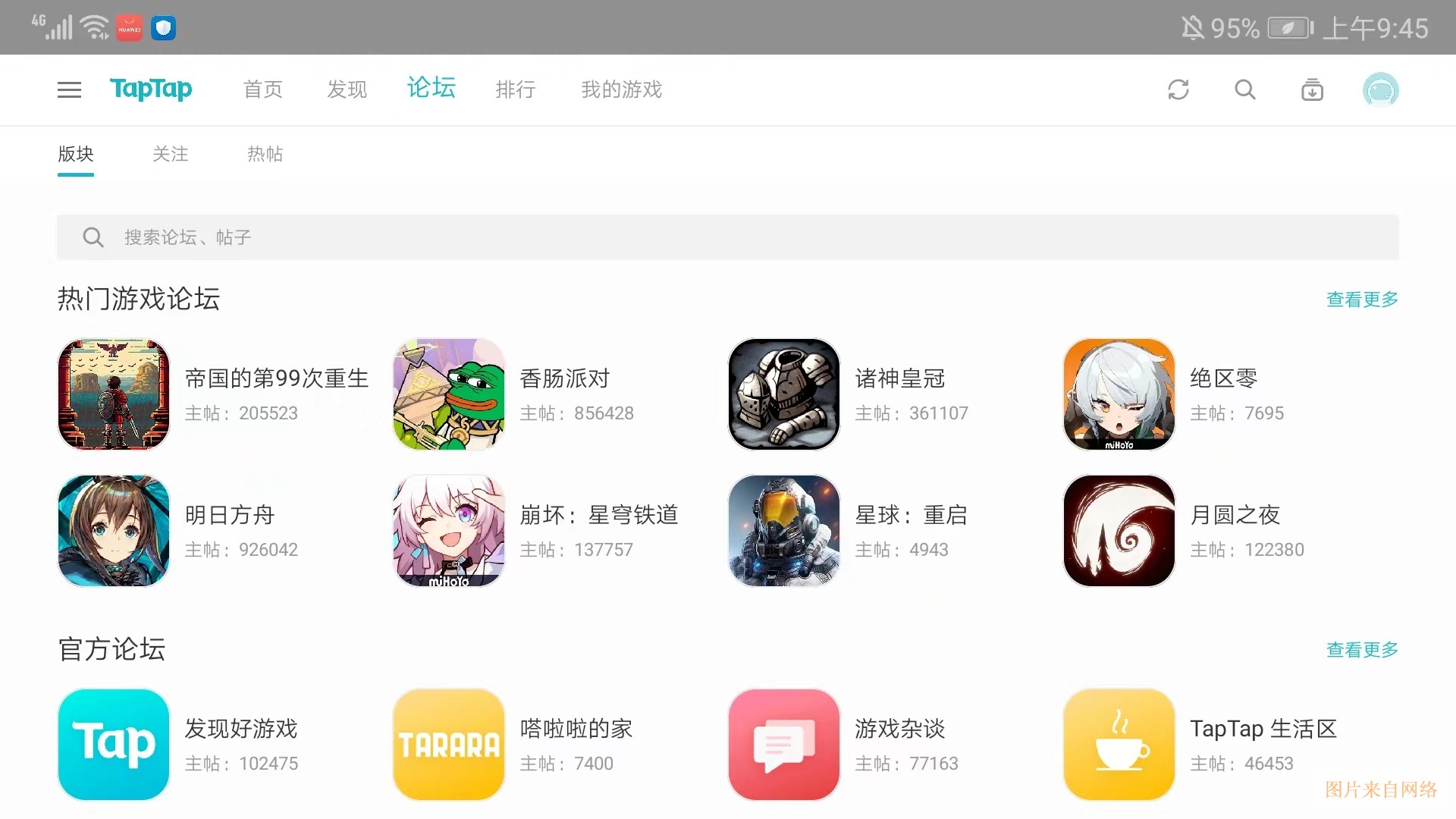 5、进入【论坛】界面,包括热门游戏论坛、官方论坛和个人论坛等不同的论坛,玩家可以在这里交流分享,