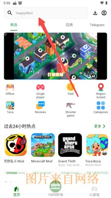 1、将下载的最新版happymod打开,想玩什么游戏直接在搜索框中搜索。