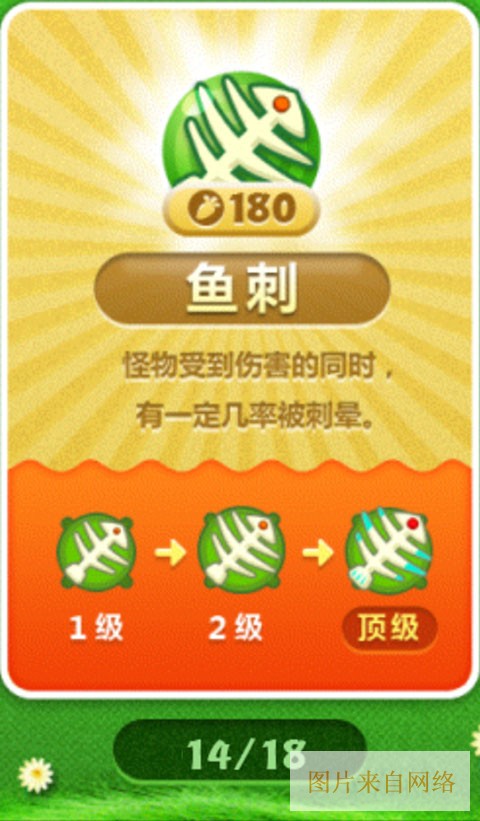 具有一定群体控制属性的单体伤害炮塔,输出还可以,用来攻击巨怪以及清道具皆可。一定几率的群体控制决定了其不仅能用作单体输出,还可以配合群体输出。特殊用法是大量鱼刺集中输出,可以达到不完美的彻底控制(毕竟还得靠几率),虽然不完美但比普通的减速靠谱得多,而且其本身能进行输出,在这种阵型下可以达到群体伤害的最终效果。