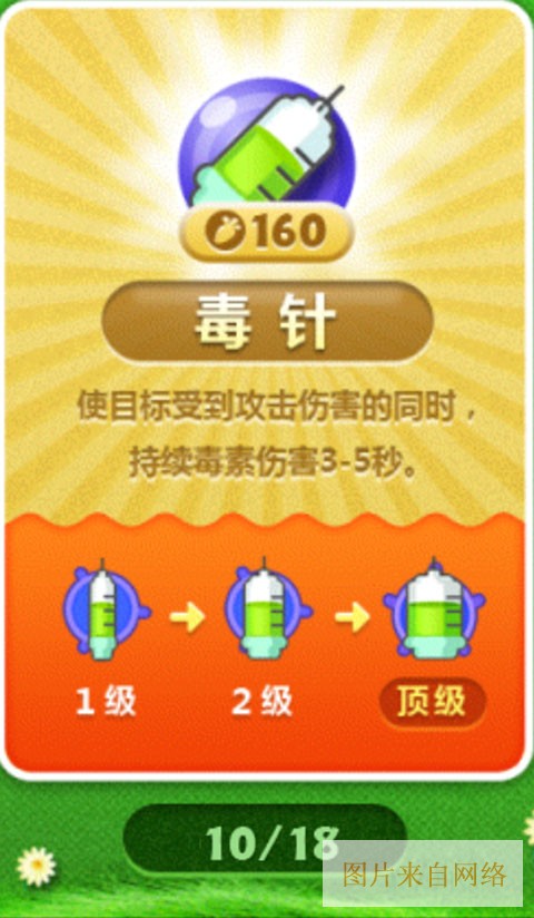 特殊的单体伤害炮塔,特殊属性是持续伤害,在道路较长的地图中较有优势,道路短就基本没用了。因其攻击范围较小,放在边角处可以产生不完美的群伤效果(飞行怪有时能躲过),主要用来清道具及辅助输出。(冬季的第1关几乎就是对毒针进阶用法的教学。)
