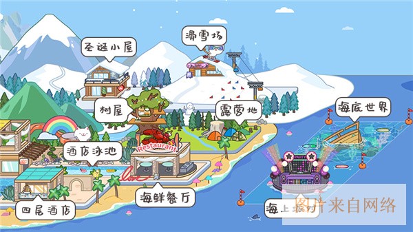 8、圣诞小屋、滑雪场、树屋、露营地、海底世界、酒店泳池、四层酒店、海鲜餐厅、海上派对;
