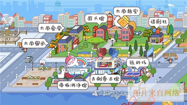 2、大学宿舍、大学食堂、图书馆、大学教室、话剧社、滑板游泳馆、击剑拳击馆,运动场;