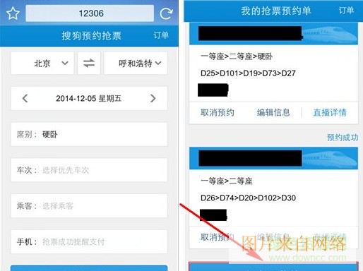 登陆界面点击“预约抢票”就可开始我们的“约票”之旅了,进入后就可以根据自己的出行需要选择火车的起始点、时间、席别、车次、乘车人等相关信息,最后填写上自己的电话号码点击“提交预约单”,整个“约票”操作就正式结束了。剩下的就是搜狗手机浏览器在当次火车票开售时,全自动并且可以7*24小时离线为用户抢票。一旦抢购成功,会再次以短信的方式通知你,你只需负责最后的支付环节就好。