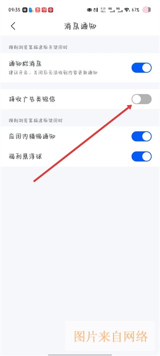 4、在消息通知页面中,找到接收广告类短信对应的开关,点击关闭该开关。