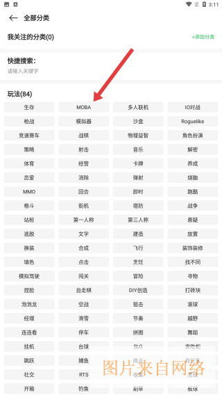 3、在全部分类页面中,找到玩法分类下的MOBA选项并点击,即可查看该品类下的各类游戏,挑选心仪作品游玩。