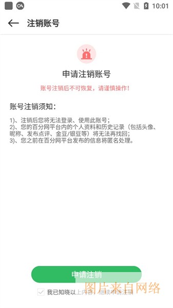3、在注销账号页面中需要注意:账号注销后不可恢复,仔细阅读了解账号注销须知详情后,将屏幕最下方的知晓以上内容勾选;