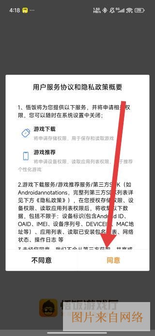 1、打开悟饭游戏厅,阅读用户服务协议及隐私政策概要后,点击同意按钮,进入应用主界面。