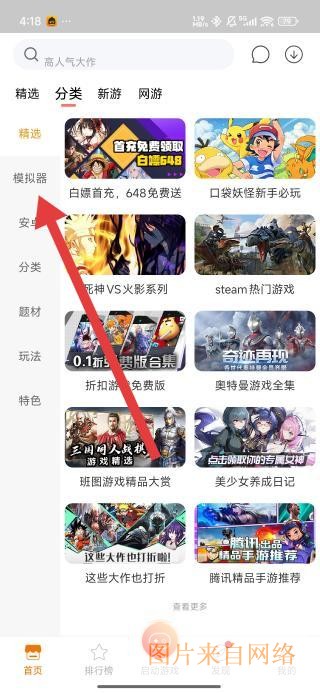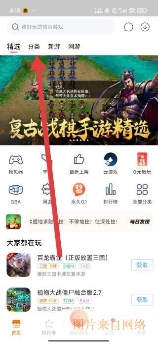 2、在悟饭游戏厅主界面,可以点击顶部精选右侧的分类标签,进入游戏分类浏览页面。