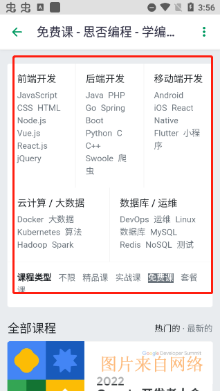 进入相应的课程后,我们还可以通过前端、后端、移动端或云计算、大数据等多个标签进行检索