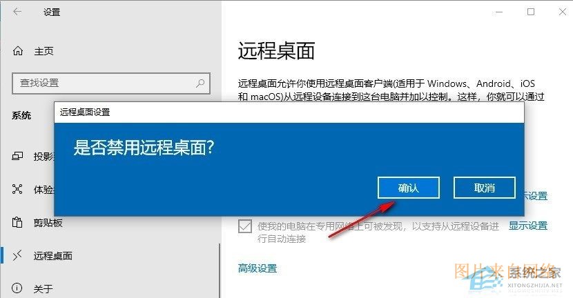 5. 关闭该开关按钮之后,页面中会出现一个是否禁用远程桌面的弹框,我们在弹框中点击“确认”选项即可。